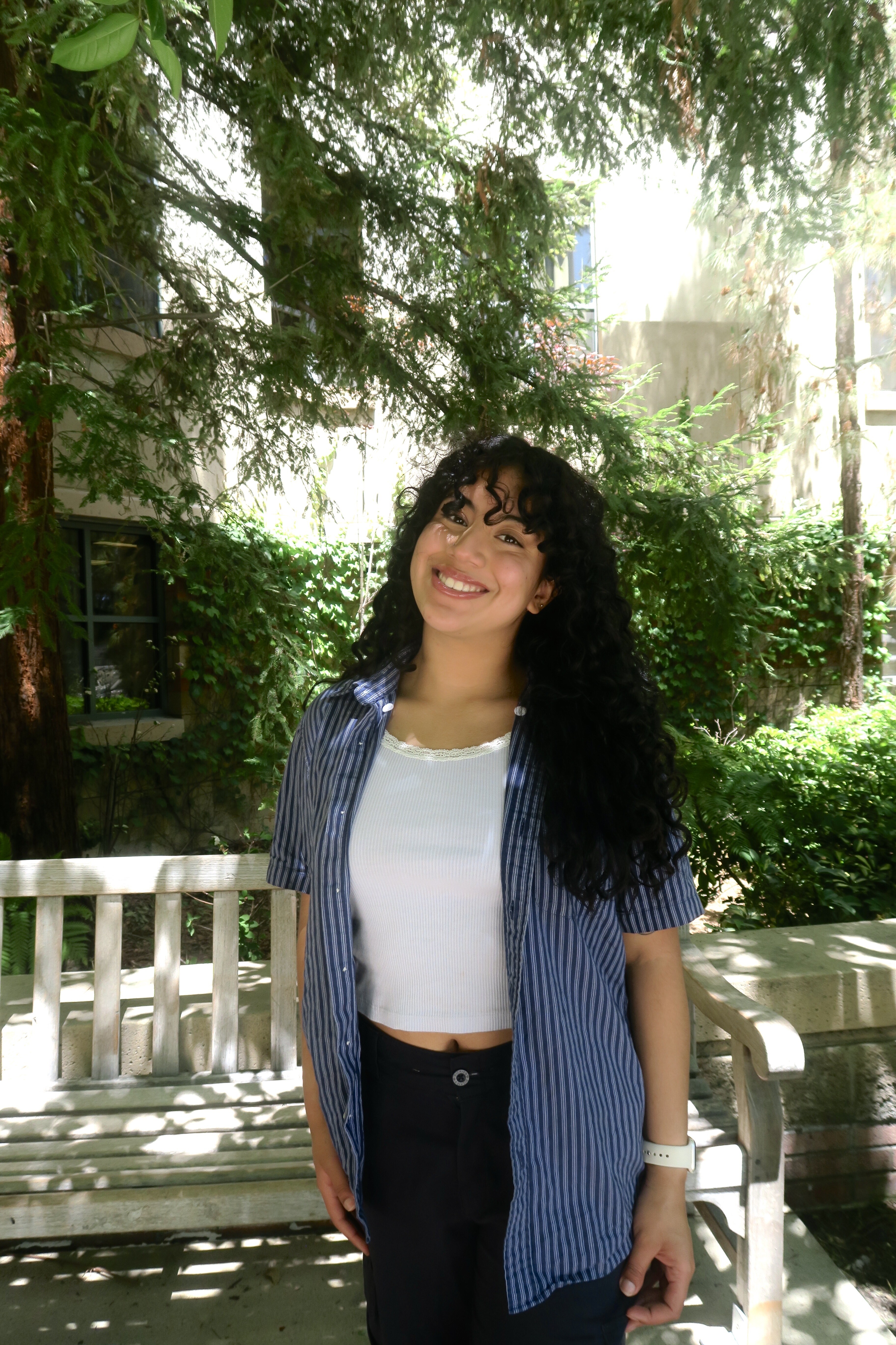 First, I found some navy-blue work pants that paired nicely with a blue button-up I found. I styled the look by wearing the shirt open and unbuttoned, layered over a laced tank as the foundation.
